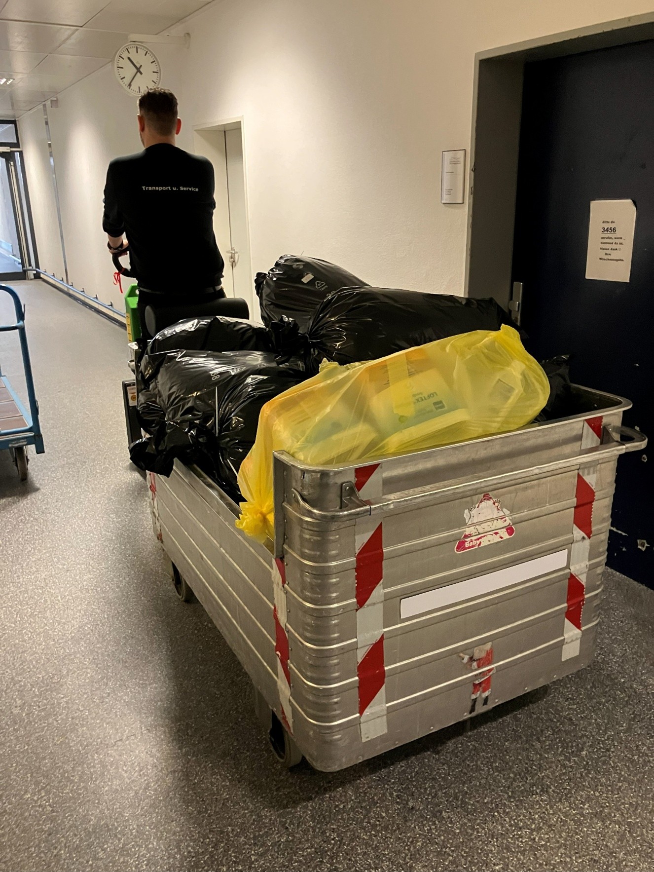 Die Verteilung von Material bzw. die Entsorgung von Abfällen erfolgt innerhalb des Krankenhauses hauptsächlich mit manuell geschobenen Wagen, teilweise auch mit Hilfe von el. Zuggeräten. Grundsätzlich können auf diese Weise auch größere Materialmengen mit vertretbaren körperlichen Belastungen transportiert werden. Dafür ist es aber sehr wesentlich, dass Wagen und andere Transportgeräte für die vorgesehenen Zwecke gut geeignet und in einwandfreiem Zustand sind. Typische Missstände, die es zu vermeiden gilt, sind: